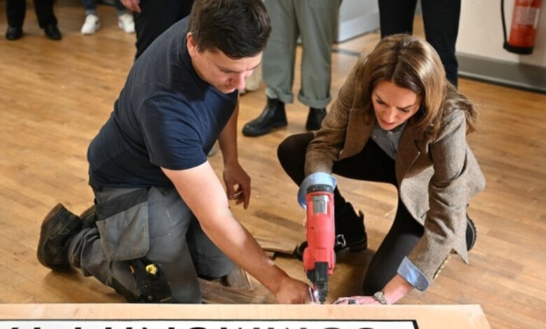 Prenses Kate, eline matkap ve çivi tabancası alarak merkezin tabelasını takmak için çalışanlara yardımcı oldu.