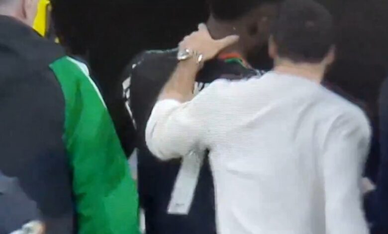 Real Madrid’in kaptanlarından Dani Carvajal sakatlığı nedeniyle maç takımında olmamasına karşın alana indi ve Saka’nın üzerine yürüdü.