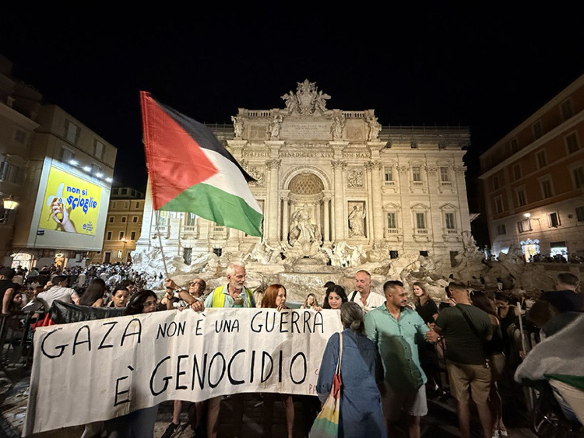 Grup, Roma Belediyesi’nin teşebbüsünde yer alan “Gazze’de savaşı durduralım” yazısına reaksiyonlarını, “Gazze’deki bir savaş değil, bir soykırım” yazılı bir döviz açarak gösterdi.