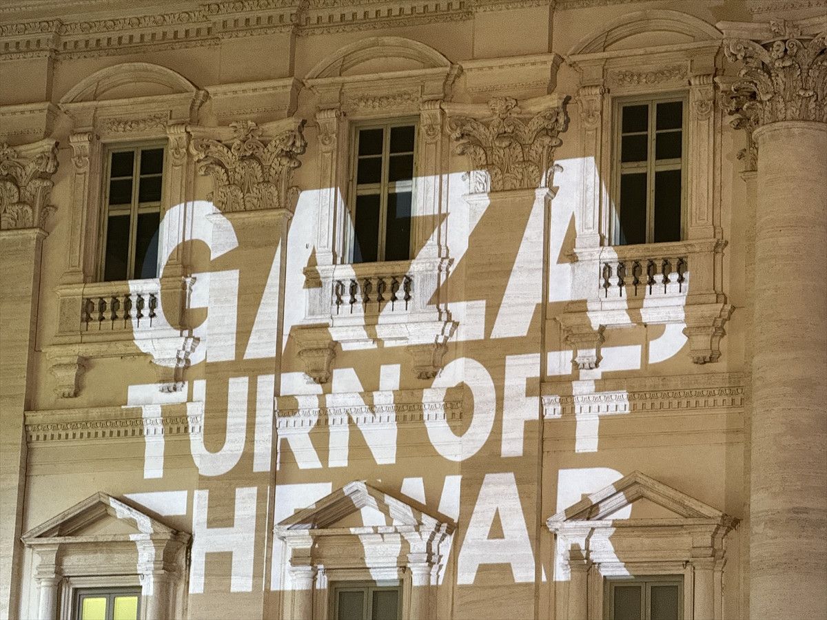 Çeşmenin ardındaki tarihi Poli Sarayı’nın ön cephesine de “Gazze’de savaşı durduralım” yazısı yansıtıldı.
