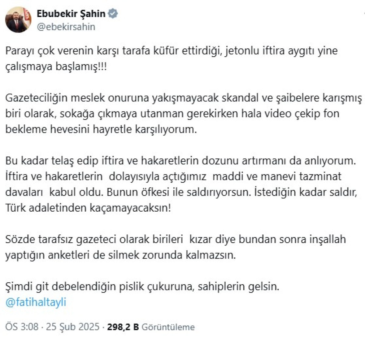 Parayı çok verenin karşı tarafa küfür ettirdiği, jetonlu iftira aygıtı tekrar çalışmaya başlamış!!! Gazeteciliğin meslek onuruna yakışmayacak skandal ve şaibelere karışmış biri olarak, sokağa çıkmaya utanman gerekirken hala görüntü çekip fon bekleme hevesini şaşkınlıkla karşılıyorum. Bu kadar telaş edip iftira ve hakaretlerin dozunu artırmanı da anlıyorum. İftira ve hakaretlerin münasebetiyle açtığımız maddi ve manevi tazminat davaları kabul oldu. Bunun öfkesi ile saldırıyorsun. İstediğin kadar saldır, Türk adaletinden kaçamayacaksın! Kelamda tarafsız gazeteci olarak birileri kızar diye bundan sonra inşallah yaptığın anketleri de silmek zorunda kalmazsın. Artık git debelendiğin pislik çukuruna, sahiplerin gelsin, Fatih Altaylı.