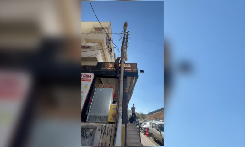 Zincir markete gelen usta Kadir Kayış elektrik direğine tırmandı.