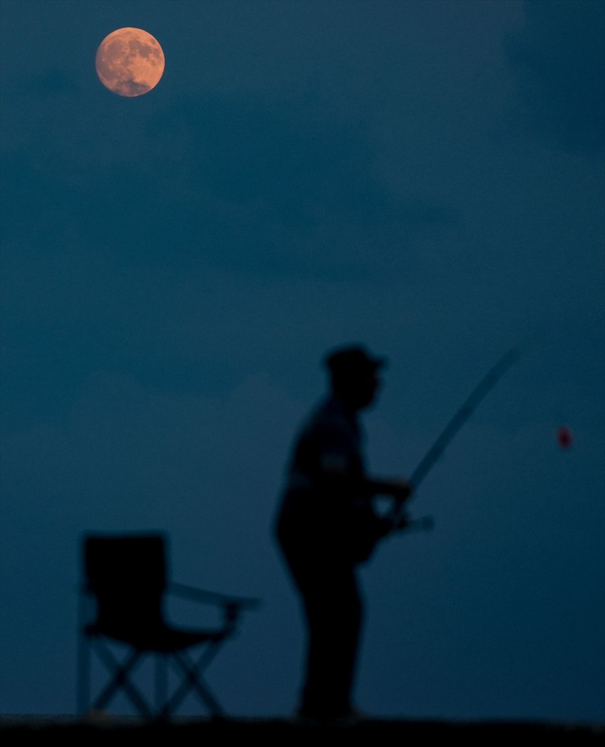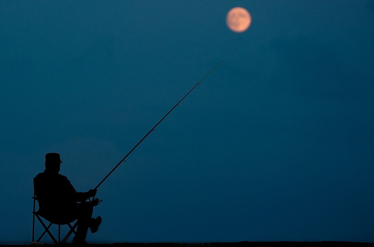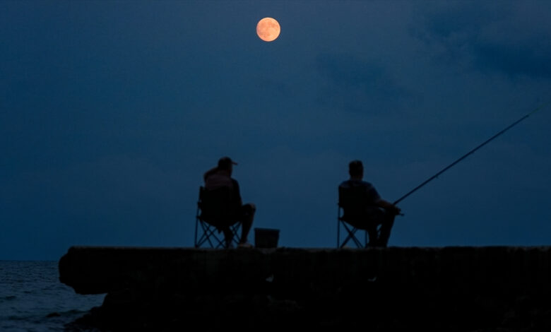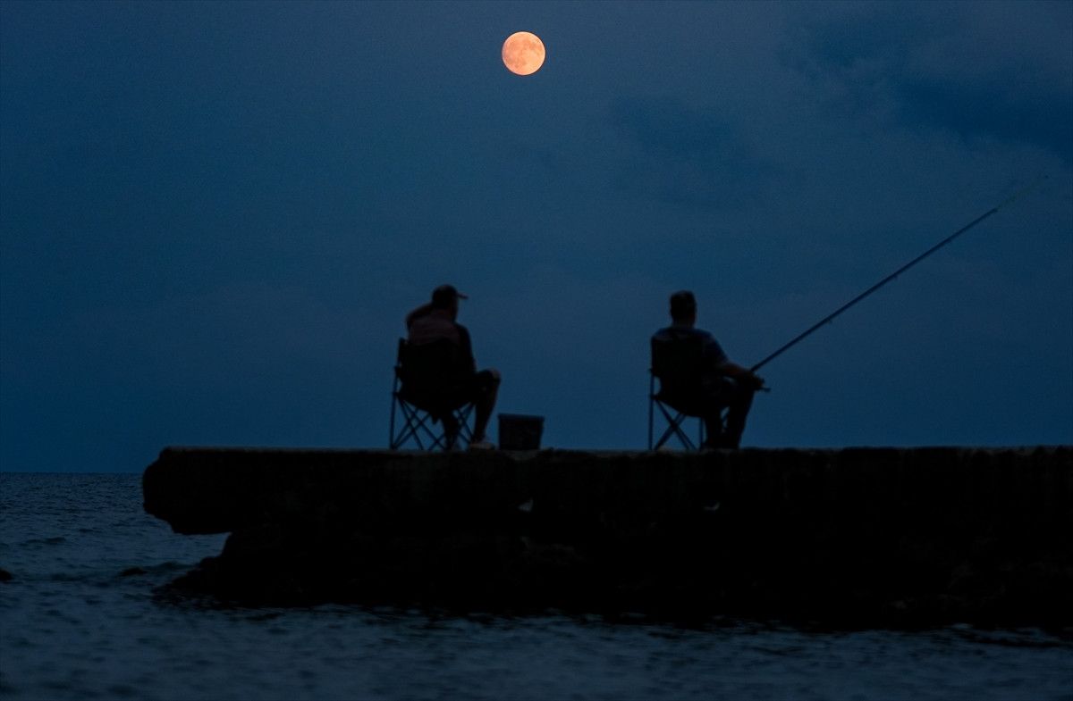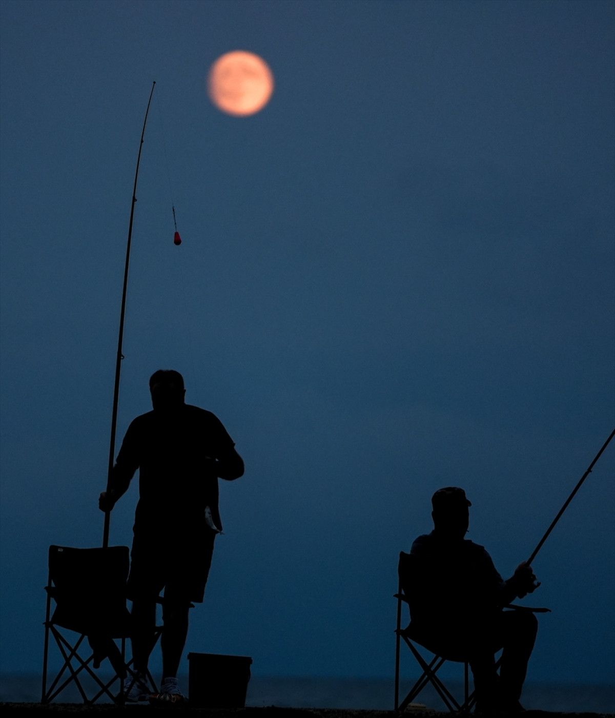 Sinop’ta kıyıda bulunan balıkçılarla birlikte ay görünümü hoş imgeler oluşturdu. Kentteki görüntü, masalları anımsattı.