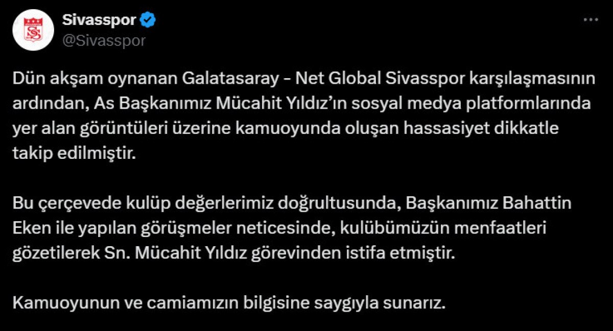 Dün akşam oynanan Galatasaray-Sivasspor müsabakasının akabinde, Asbaşkanımız Mücahit Yıldız’ın toplumsal medya platformlarında yer alan manzaraları üzerine kamuoyunda oluşan hassasiyet dikkatle takip edilmiştir. Bu çerçevede kulüp kıymetlerimiz doğrultusunda, Liderimiz Bahattin Eken ile yapılan görüşmeler sonucunda, kulübümüzün menfaatleri gözetilerek Mücahit Yıldız misyonundan istifa etmiştir. Kamuoyunun ve topluluğumuzun bilgisine hürmetle sunarız.