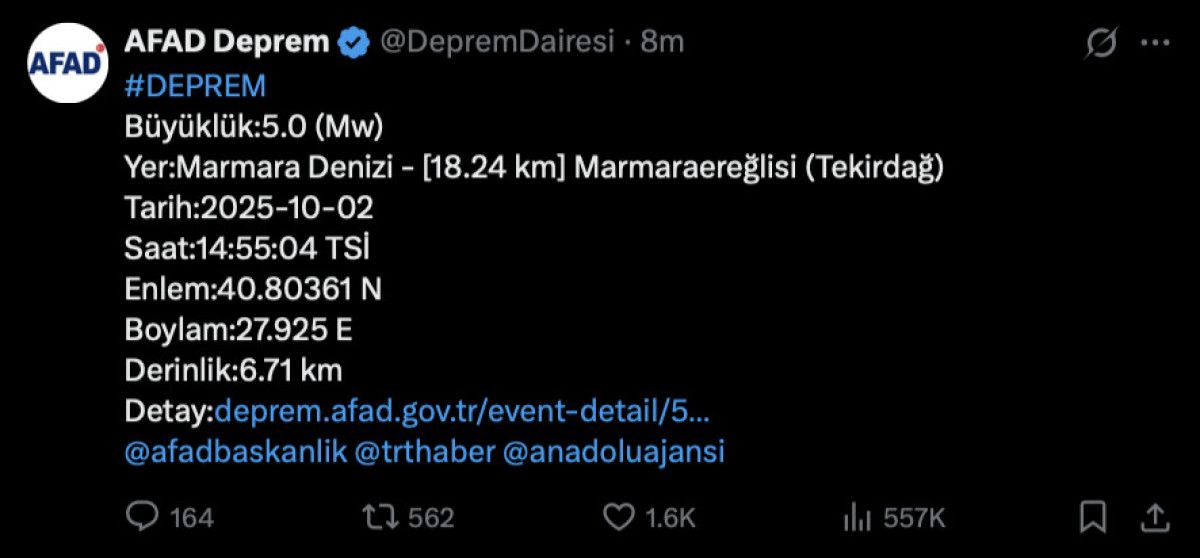AFAD’dan gelen açıklamaya nazaran, Tekirdağ Marmaraereğlisi açıklarında 5.0 şiddetinde bir sarsıntı meydana geldi.