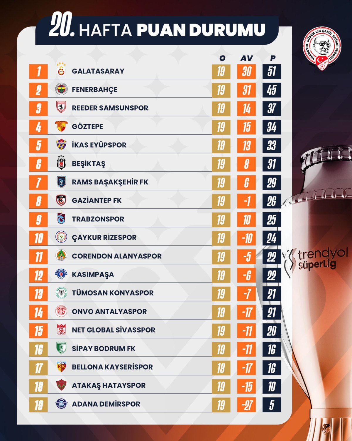 Süper Lig’de 20. haftanın ardından oluşan puan durumu ve 21. haftanın fikstürü
