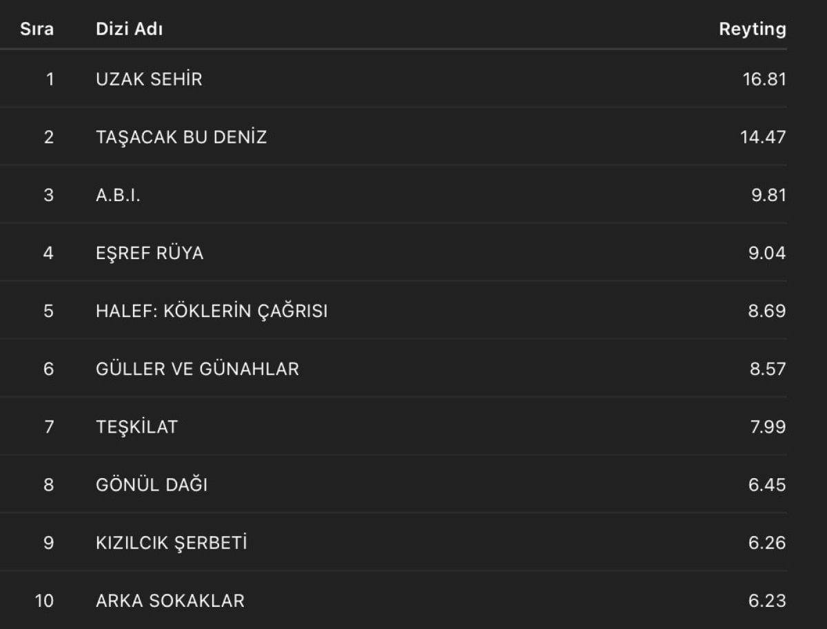 Tablo değişti! Geçen haftanın reyting sonuçları: A.B.İ., Uzak Şehir, Taşacak Bu Deniz…