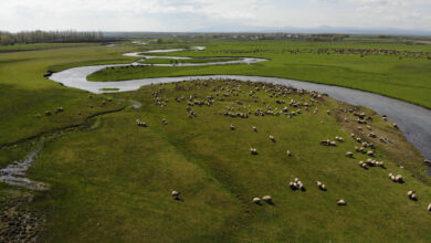 Kars’ta sıcaktan etkilenen koyunları derede serimlettiler