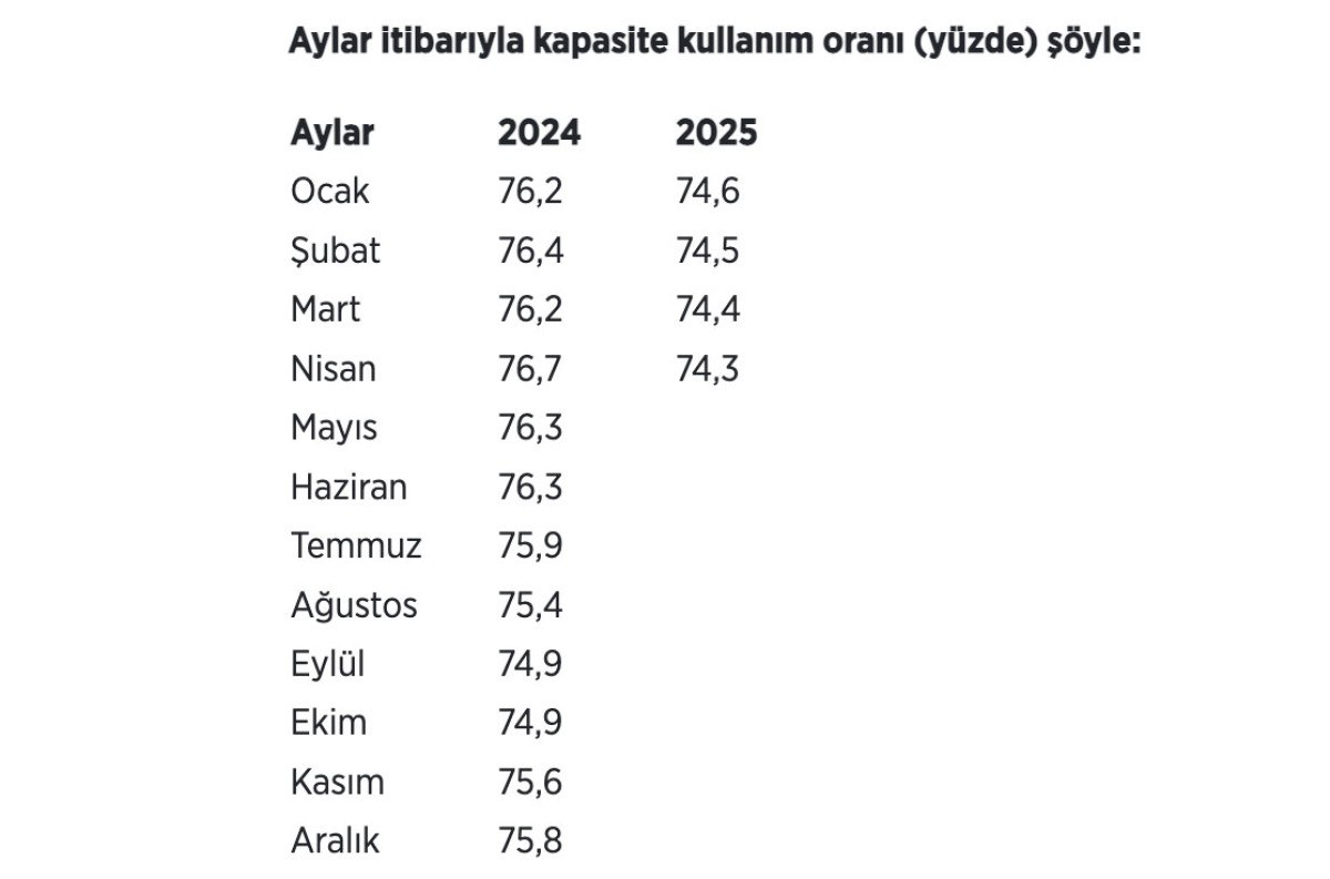 Mevsimsel tesirlerden arındırılmış kapasite kullanım oranı nisanda (KKO-MA) geçen aya nazaran 0,6 puan düşerek yüzde 74,6’ya geriledi.