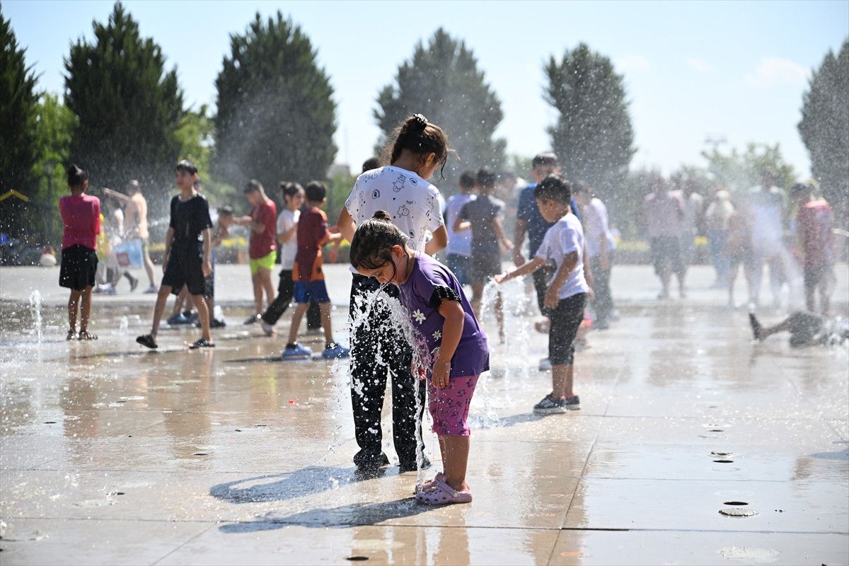Şahinbey Parkı’ndaki çocuklar ise su fıskiyesinde oynayarak serinledi.