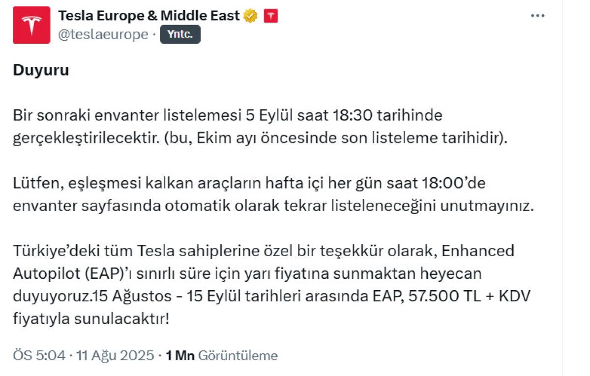 Tesla’dan yapılan açıklamaya nazaran sıradaki envanter listelemesi 5 Eylül saat 18.30 tarihinde olacak.
