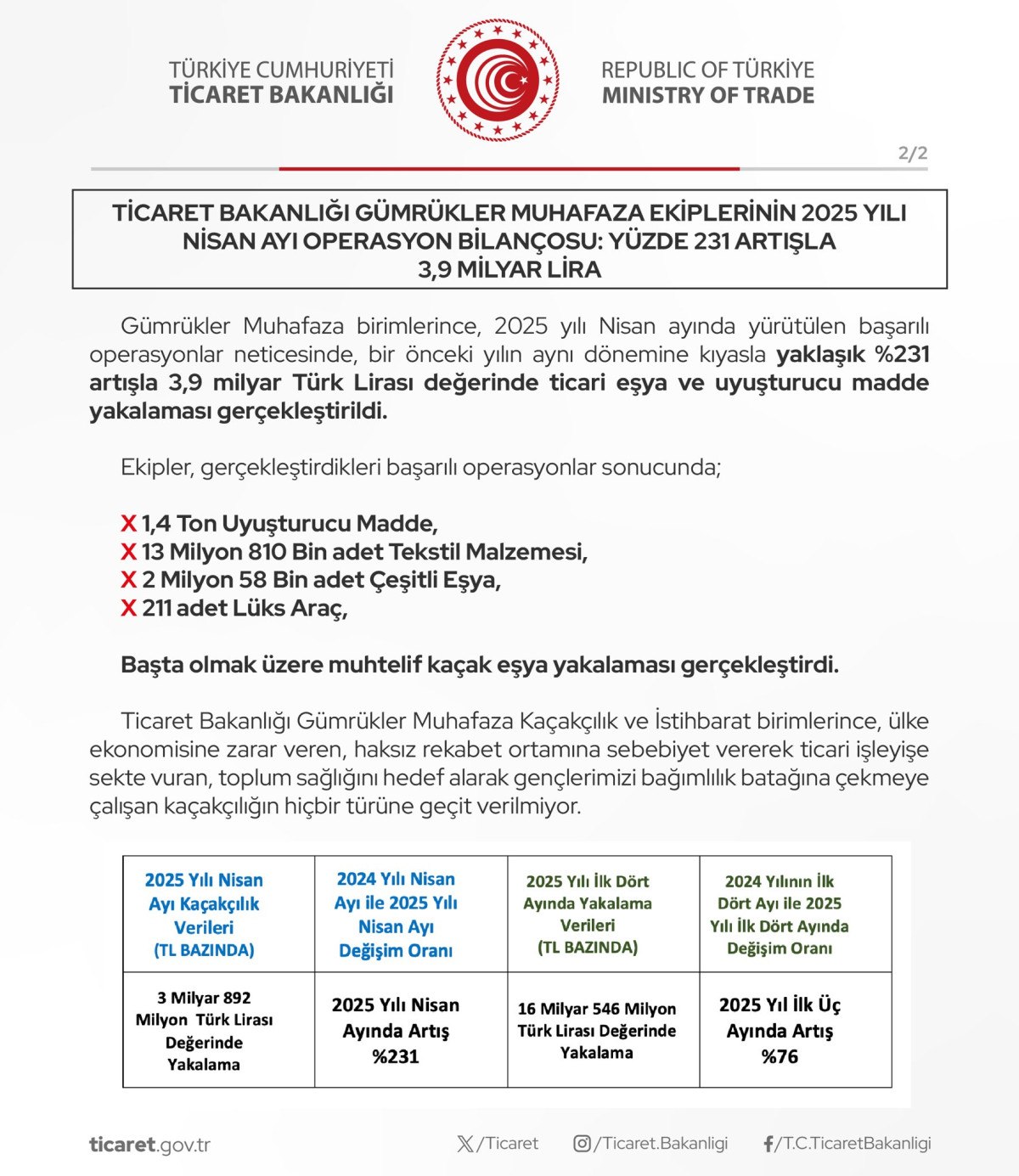Ocak-Nisan devrinde düzenlenen 2.349 operasyonda toplam 16,5 milyar TL bedelinde kaçak ticari eşya ve uyuşturucu unsur ele geçirilirken, sadece Nisan ayında yapılan operasyonların bilançosu geçen yılın birebir ayına nazaran yüzde 231 artışla 3,9 milyar TL’ye ulaştı.