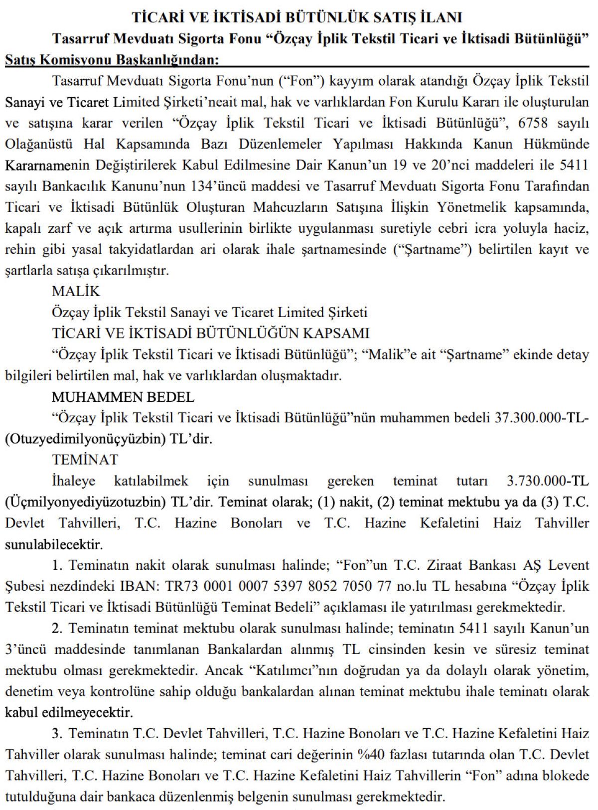 TMSF’nin Özçay İplik Dokuma Ticari ve İktisadi Bütünlüğünün satışına ait ilanı, Resmi Gazete’nin bugünkü sayısında yayımlandı.