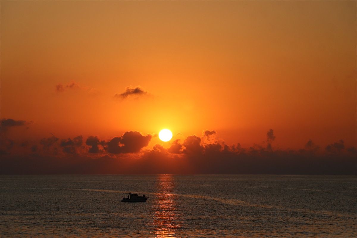 Ortahisar’da gün batımı esnasında oluşan kızıl renk, balıkçı tekneleriyle birleşince eşsiz imgeler ortaya çıktı.