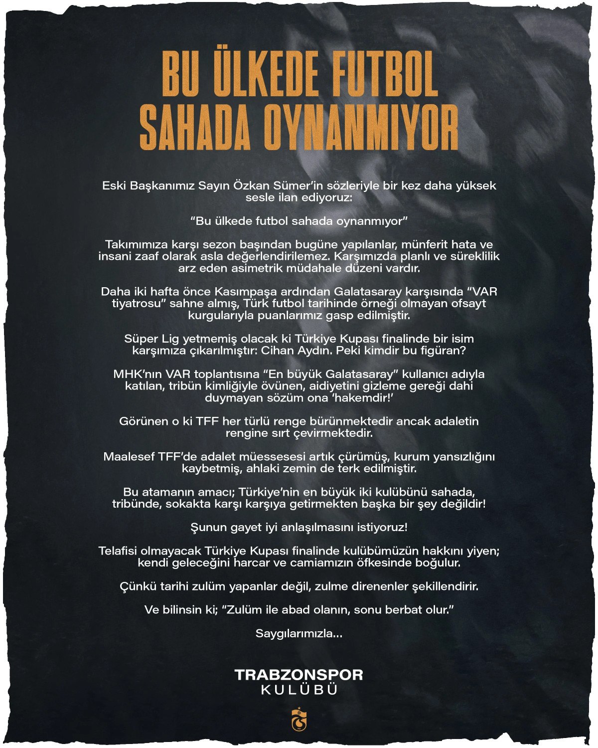 Trabzonspor’dan yapılan açıklamada, “Bu ülkede futbol alanda oynanmıyor. Zulüm ile abad olanın, sonu berbat olur” denildi.