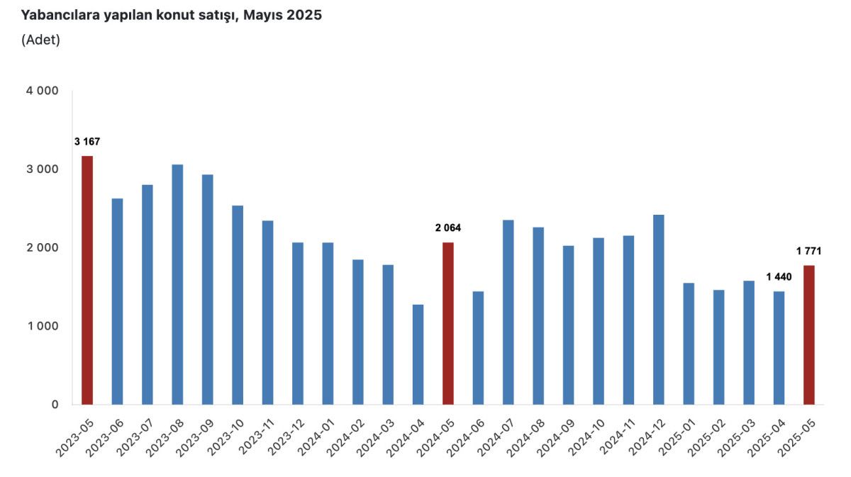 Yabancılara yapılan konut satışları mayıs ayında bir evvelki yılın birebir ayına nazaran yüzde 14,2 oranında azalarak bin 771 oldu. Mayıs ayında toplam konut satışları içinde yabancılara yapılan konut satışının hissesi yüzde 1,4 olarak gerçekleşti. Yabancılara yapılan konut satış sayısının en fazla olduğu vilayetler sırasıyla 648 ile İstanbul, 594 ile Antalya ve 145 ile Mersin oldu.