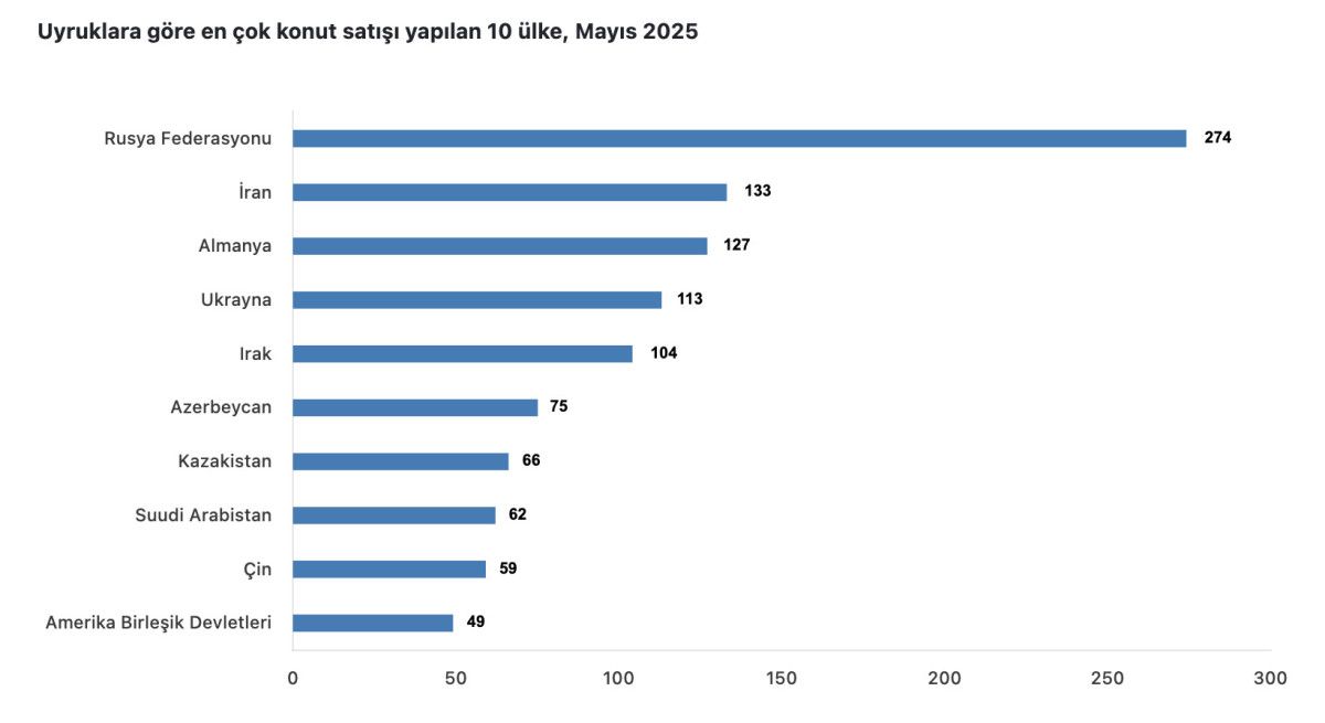 Mayıs ayında ülke uyruklarına nazaran en fazla konut satışı sırasıyla 274 ile Rusya Federasyonu, 133 ile İran ve 127 ile Almanya vatandaşlarına yapıldı.