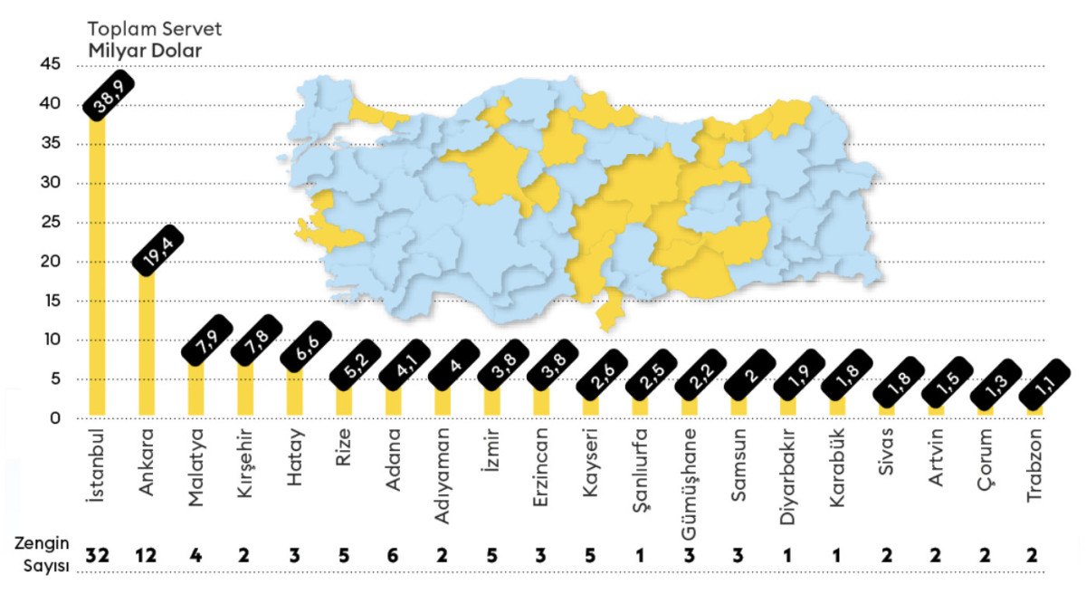 Türkiye’nin en varlıklı 100 şahsı açıklanırken, bu şahısların yaşadığı kentler de en güçlü vilayetler olarak ikinci bir sıralamaya tabi tutuldu.