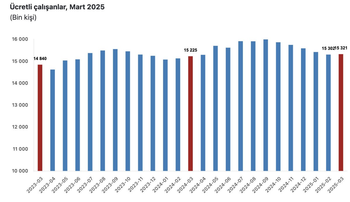 Ücretli çalışan sayısı bir evvelki yılın tıpkı ayında 15 milyon 224 bin 973 kişi iken, 2025 yılı Mart ayında 15 milyon 320 bin 987 kişi oldu.
