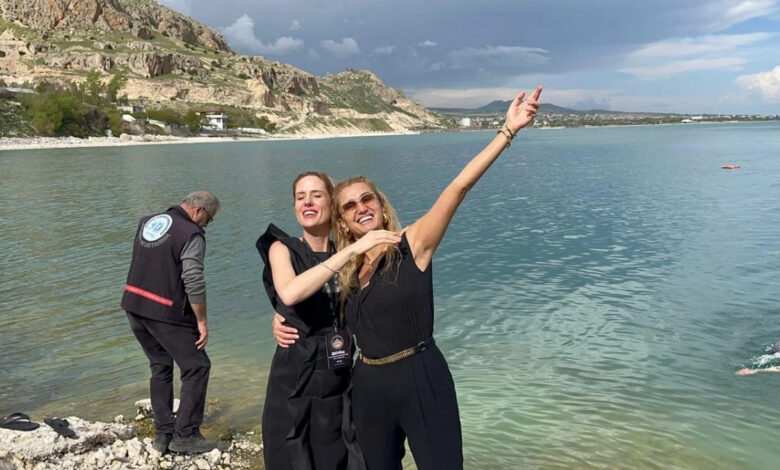 Wilma Elles Çelik ve eski model Tuğba Özay, şenlik kapsamında Adilcevaz ilçesini ziyaret ederek Van Gölü’nün soğuk sularına girdi.
