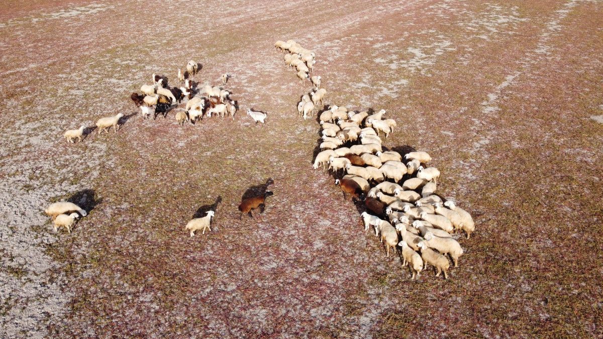 Dron kamerasıyla kaydedilen imajlarda, Esenli köyünde yer alan Gelingüllü Barajı’nın büyük oranda kuruduğu ve ortaya çıkan geniş alanlarda koyun sürülerinin otlatıldığı görüldü.
