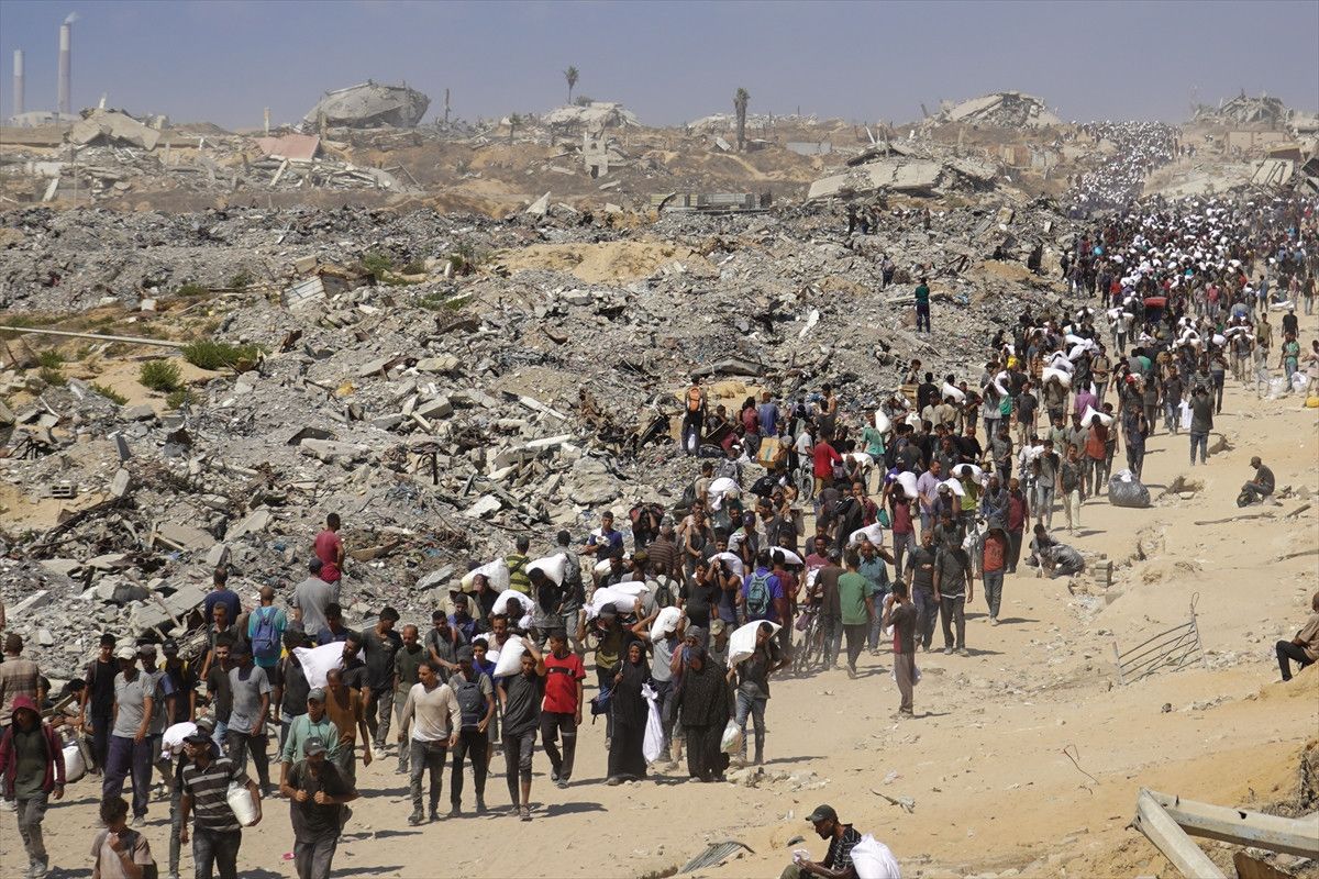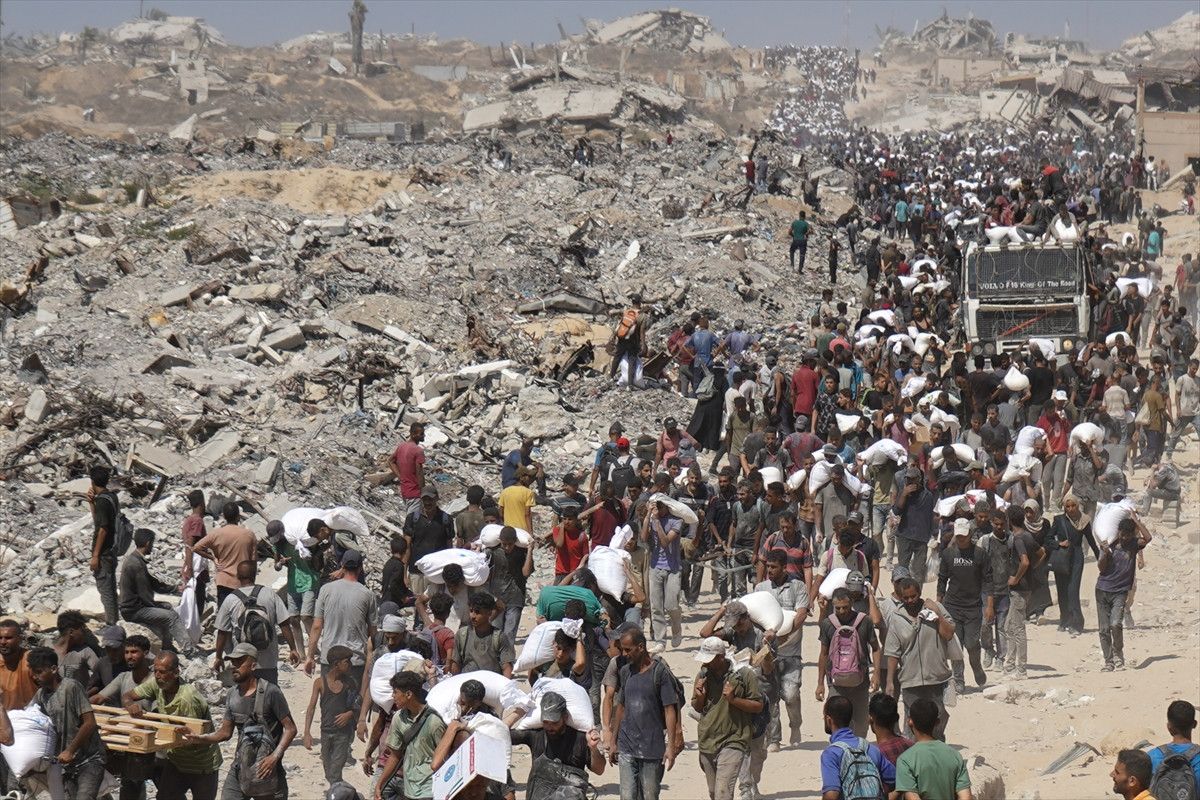 İsrail ordusunun akın ve kuşatması altındaki Gazze Şeridi’nde, un ve bebek maması taşıyan yardım tırlarının Zikim bölgesinden giriş yapmasının akabinde, yardımlara ulaşmak isteyen Filistinliler yardım noktasına akın etti.